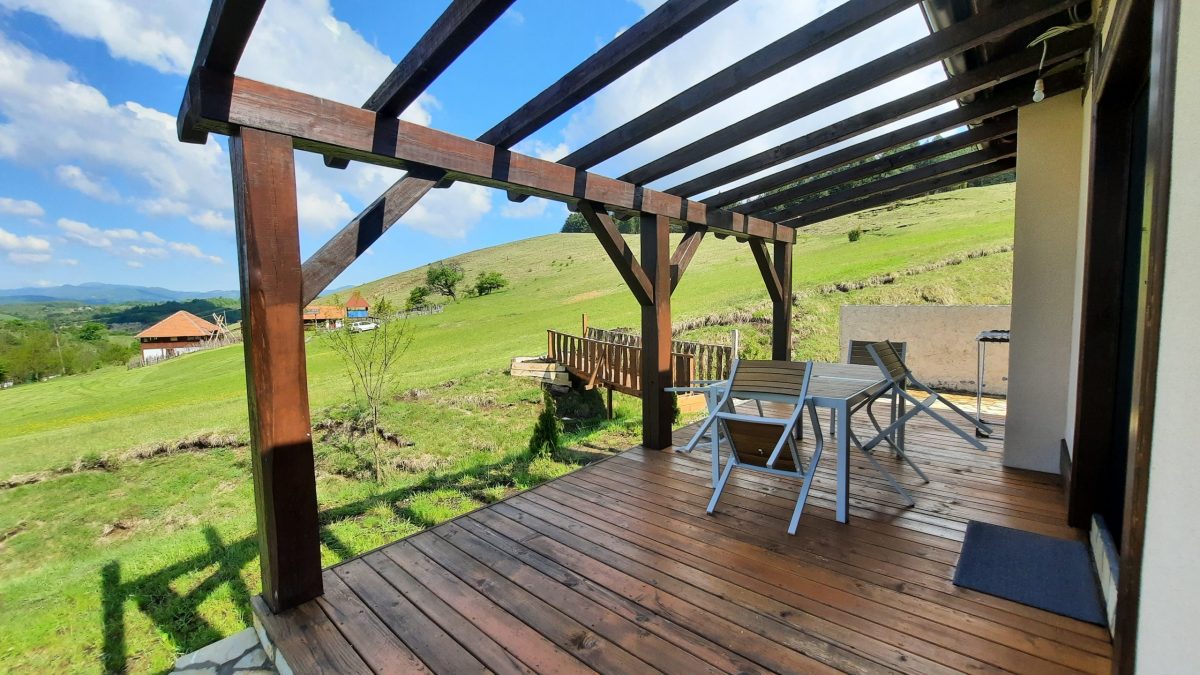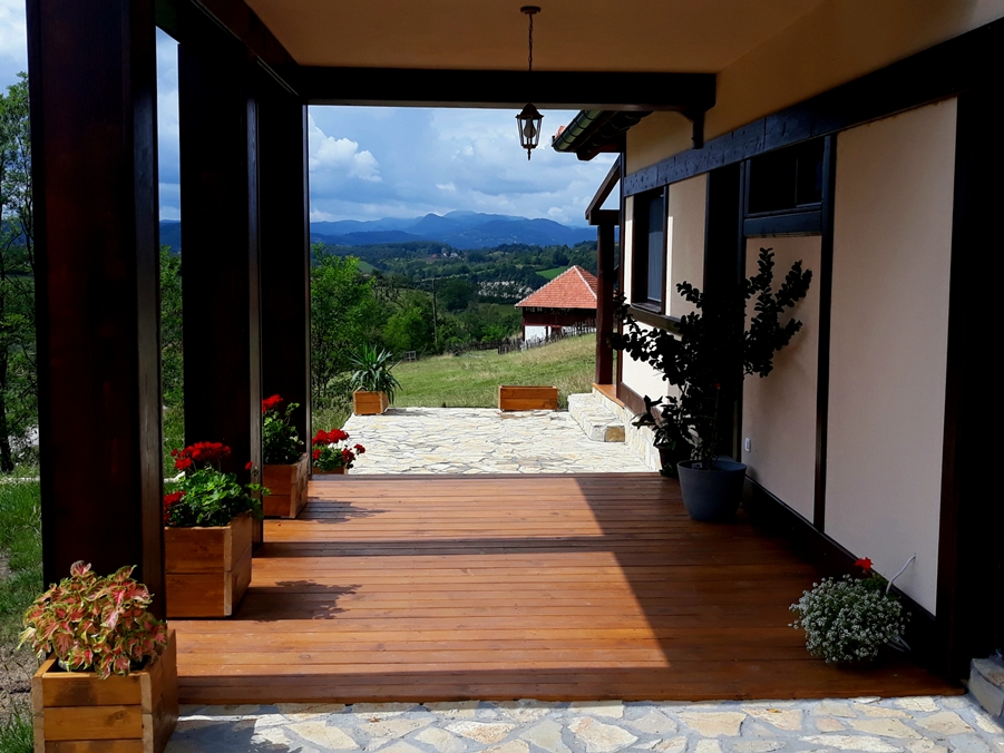 Kuća ima dve terase: Prilazna terasa, orijentisana ka Subjelu i delimično ka Pogledu Glavna terasa, povezana sa dnevnim boravkom, sa otvorenim pogledom na livadu ispred kuće i zalazak sunca iznad Pogleda Obe terase namenjene su mirnom boravku na otvorenom, u različitim delovima dana.