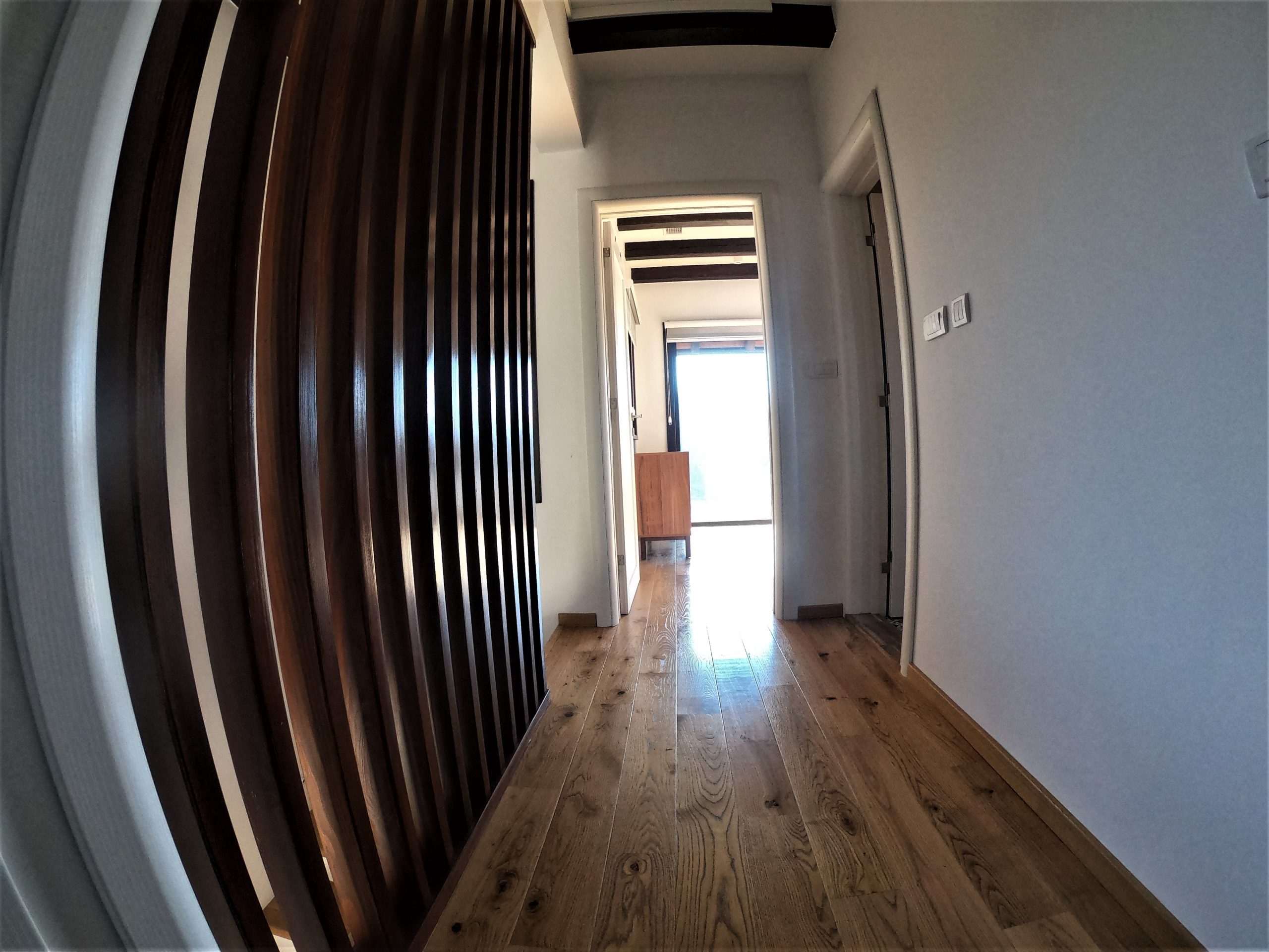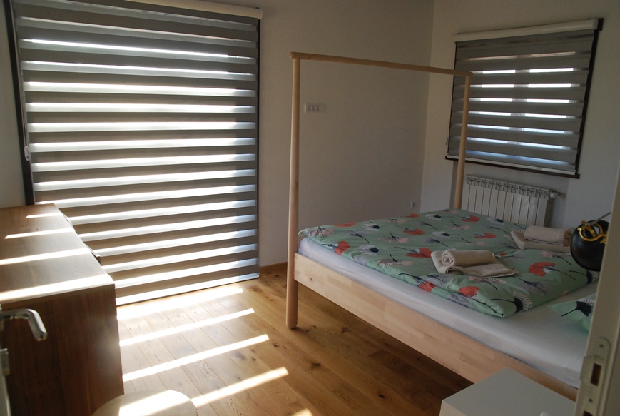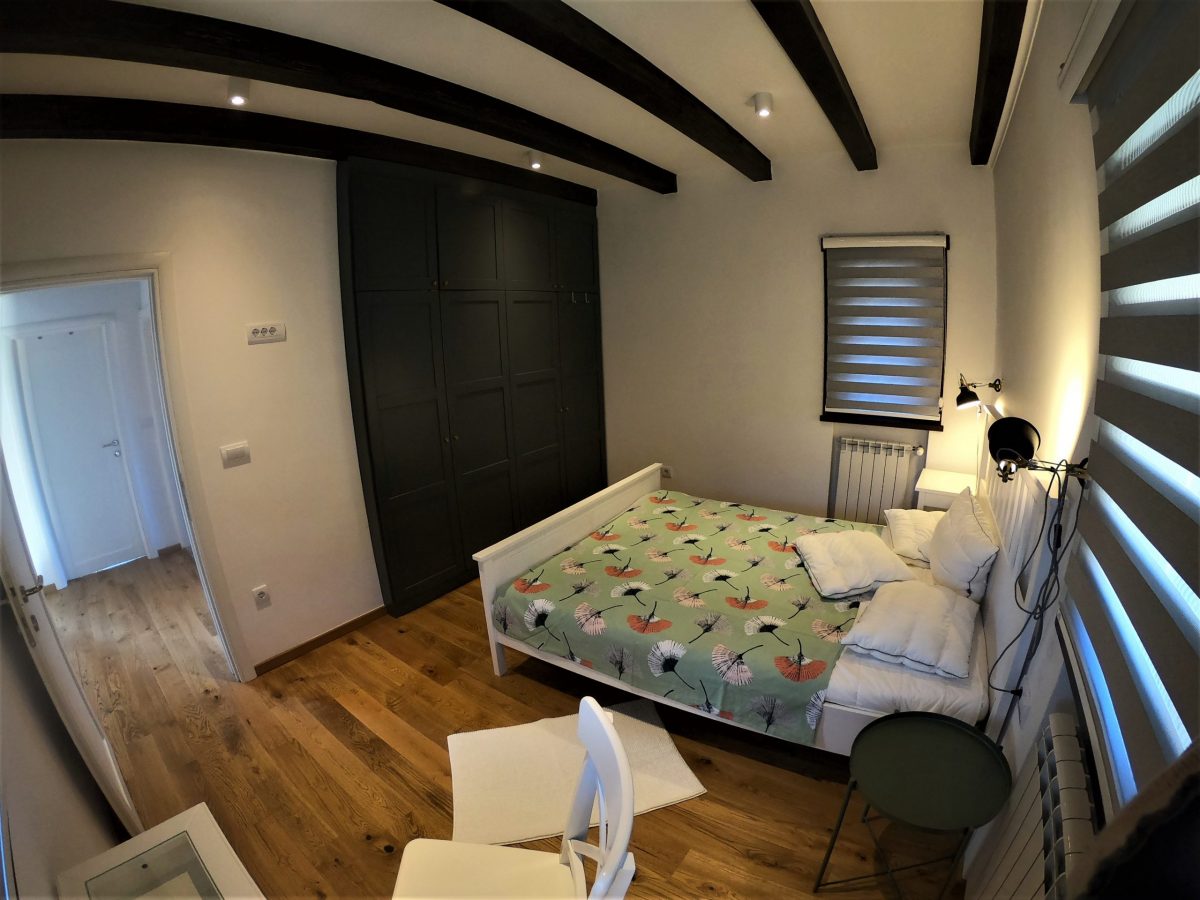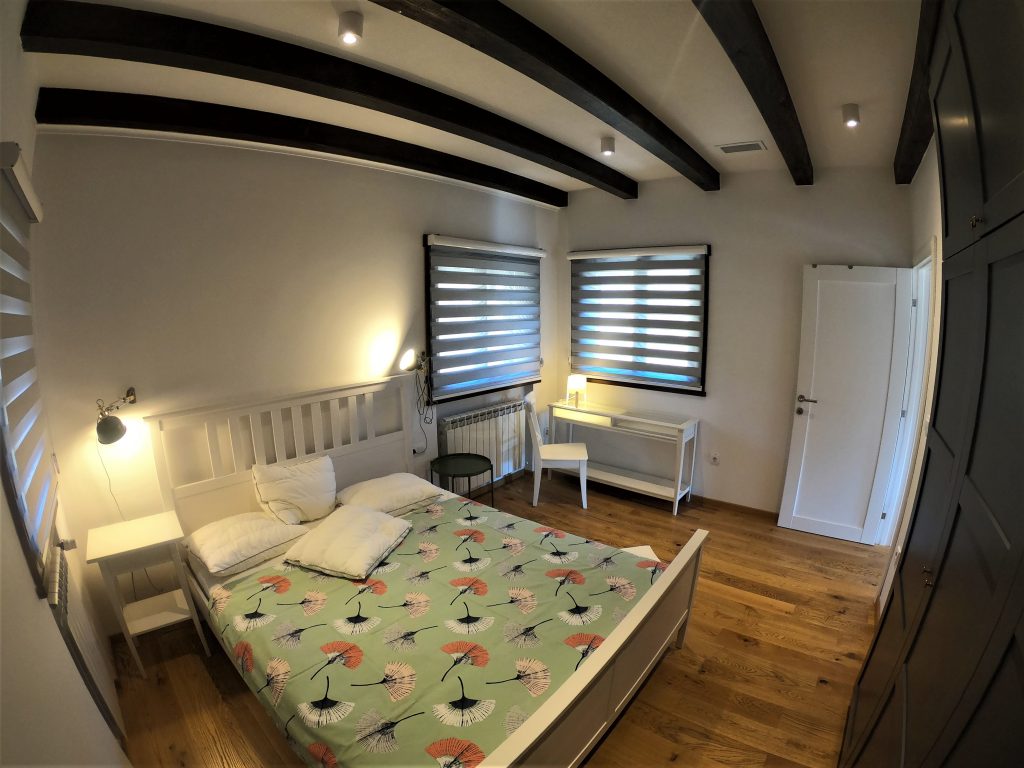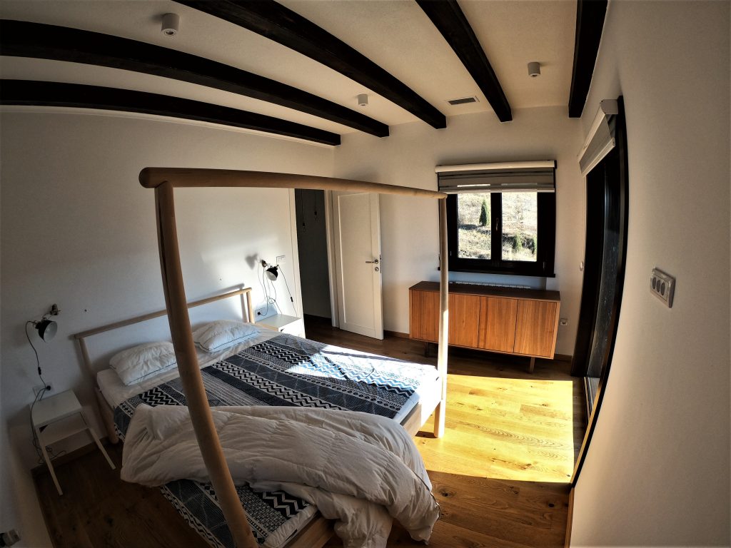 Spavaće sobe – koncept prostora Spavaće sobe na spratu razlikuju se po osećaju prostora i rasporedu. Jedna soba ima veliki svetlarnik koji prostoru daje više svetla i vizuelno je ističe kao glavnu sobu, dok je druga organizovana praktičnije, sa velikim garderobnim ormarom uklopljenim u samu sobu. Obe sobe imaju pogled ka prirodi i namenjene su mirnom odmoru, a razlika u opremi omogućava jednostavnu i funkcionalnu podelu prostora tokom boravka parova ili porodica.