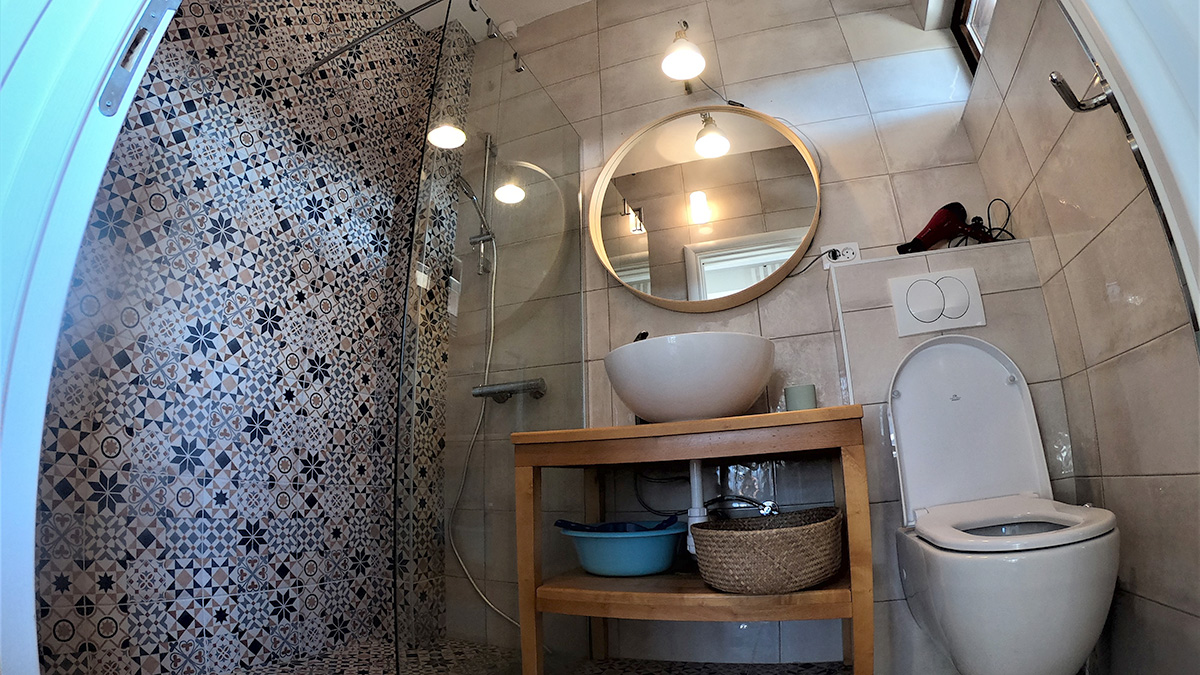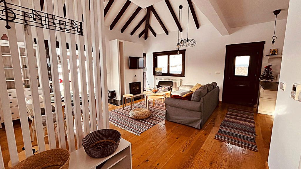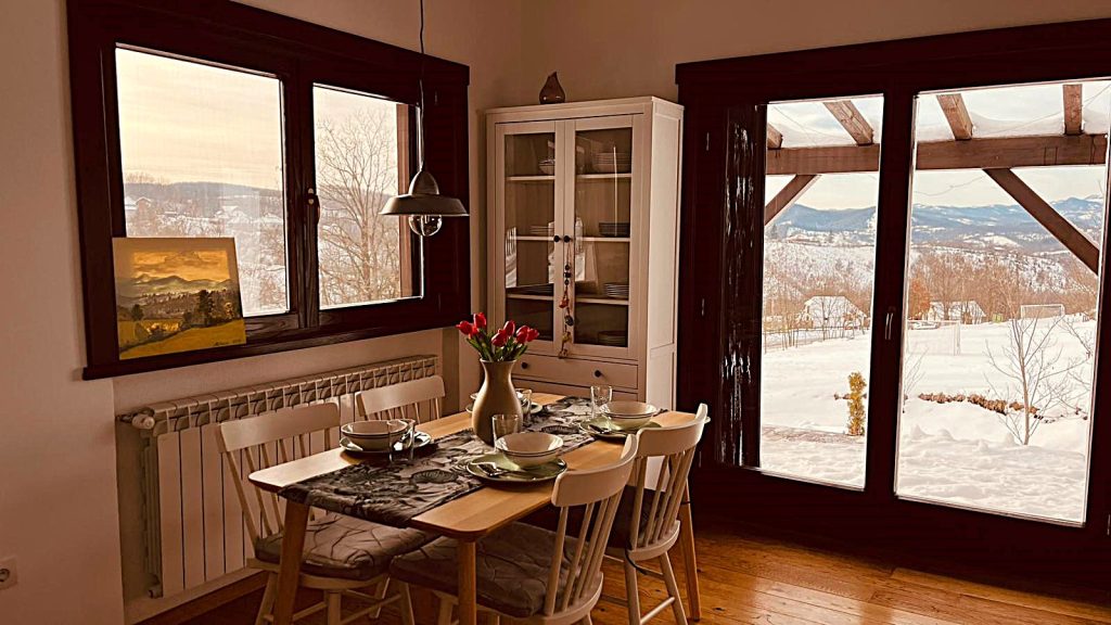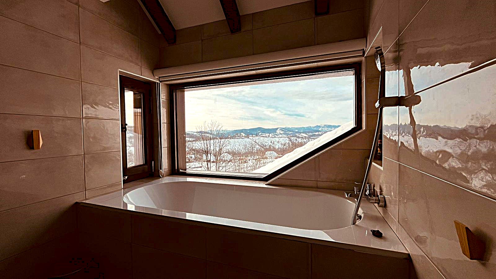 Kuća raspolaže sa dva kupatila. U prizemlju se nalazi manje, dnevno kupatilo sa tuš kabinom, praktično za svakodnevnu upotrebu i boravak u dnevnoj zoni. Na spratu se nalazi prostranije i komfornije kupatilo, sa izdvojenom kadom i direktnim pogledom ka planini, što omogućava opuštanje uz pogled na prirodu i zalazak sunca. Oba kupatila su potpuno funkcionalna i prilagođena potrebama gostiju.