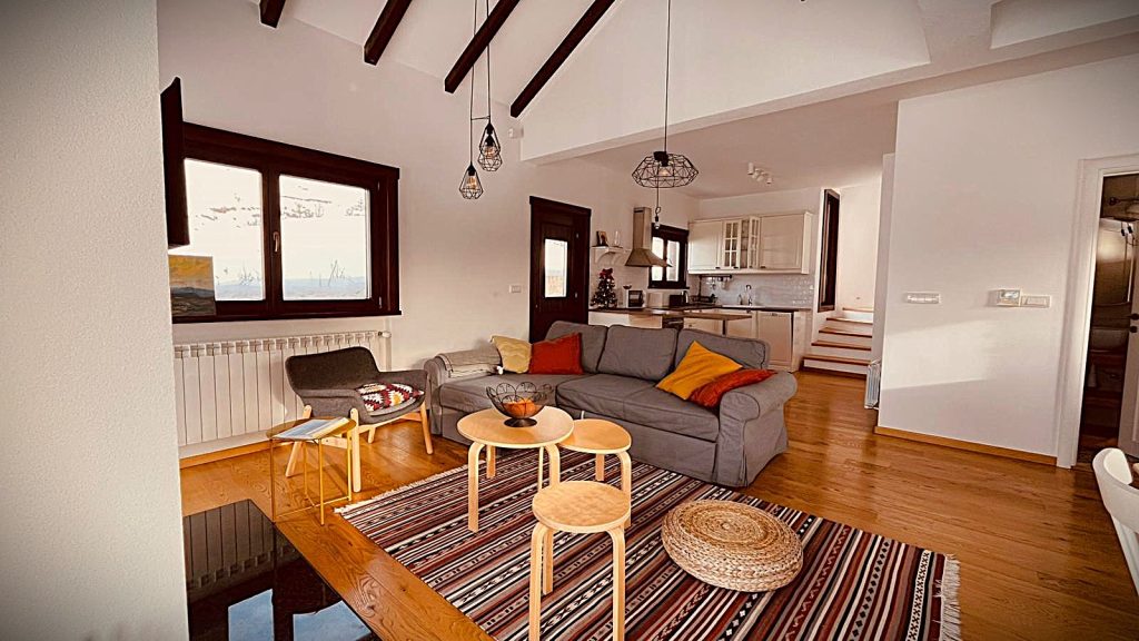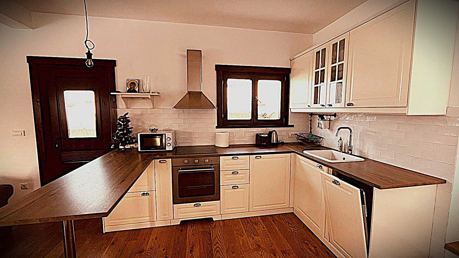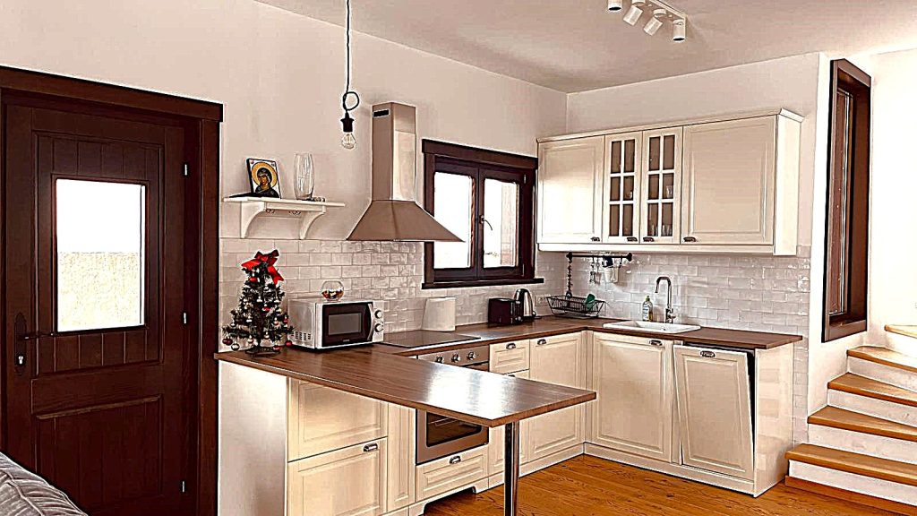 Kuhinja je zasebno pozicionirana u okviru prizemlja i funkcionalno povezana sa ostatkom prostora, dok se iz njenog dela nastavlja stepenište koje vodi ka spratu. Moderna je i potpuno opremljena, sa svim elementima potrebnim za kraći ili duži boravak gostiju, omogućavajući samostalan i nesmetan boravak bez potrebe za dodatnom asistencijom domaćina.