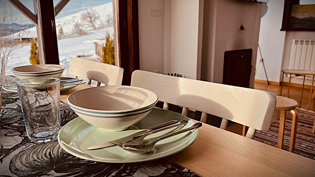 Trpezarija je blago izdvojen deo u okviru dnevne zone, namenjen zajedničkim obrocima i boravku za stolom. Opremljena je trpezarijskim stolom i vitrinom za posuđe, a zahvaljujući balkonskim vratima ima direktan pogled ka spoljašnjem prostoru i terasi, što prostoru daje dodatnu svetlost i otvorenost.